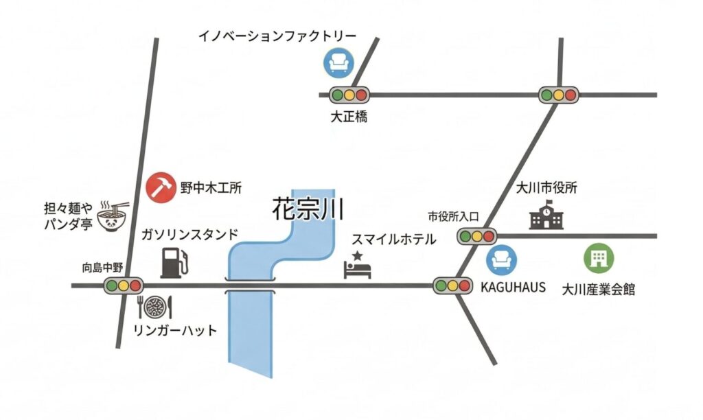 ※大川産業会館から車で5分程度。